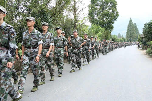 16日上午,全校新生参加了十公里野外徒步拉练。早上8点,十个营队在B区操场集合准时出发,沿着K1体育大西门——西径山方向——集贤村——青山科技大道——环城北路——K1体育南门的行军线路最后回到B区操场集合。同学们在教官、教导员、指导员的指挥下团结协作,圆满完成了拉练任务。