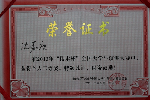 公司2012级员工沈嘉庚同学在2013年全国老员工演讲比赛中,通过努力,获得了个人三等奖的好成绩。