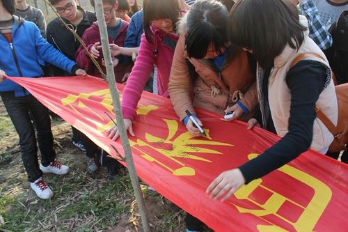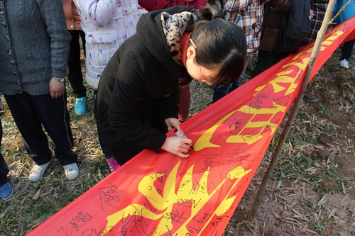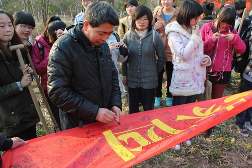 植树活动结束后,大家在“集贤学子共创绿色家园”的横幅上签下了自己的名字,并分享了经验和心得体会。梁立军书记在分享中讲到:“种下去的树要压紧土、浇透水,以便包围根的土球和其他土壤充分的结合,使树苗能及时从周围环境汲取养分。这就像我们大家,要学会与周围的人进行沟通,融入到集体中,这样才能健康的成长。”同学们纷纷表示要多开展这样有意义的活动,这份绿色不仅种在土里,更扎根在我们的心里。