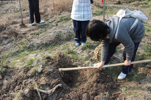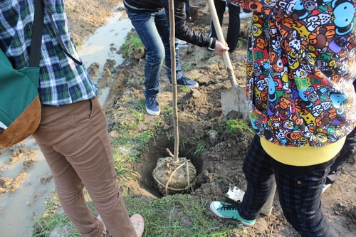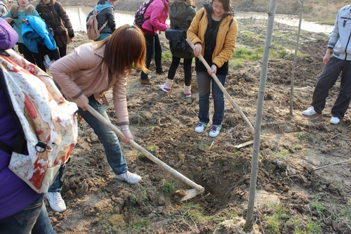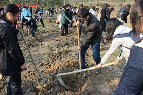 在和煦的阳光下,老师和同学们干得热火朝天。有的扛树苗,有的挖土,有的回填,大家都想在这春日里种下一份绿色播撒一片希望,为生态性大学的建设贡献自己的一份力量。