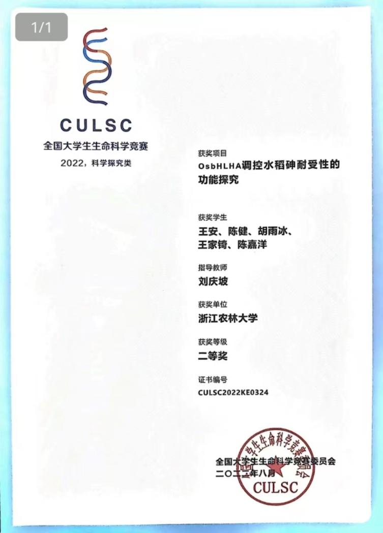 2022年浙江省第十四届老员工生命科学竞赛获一等奖、全国老员工生命科学竞赛二等奖