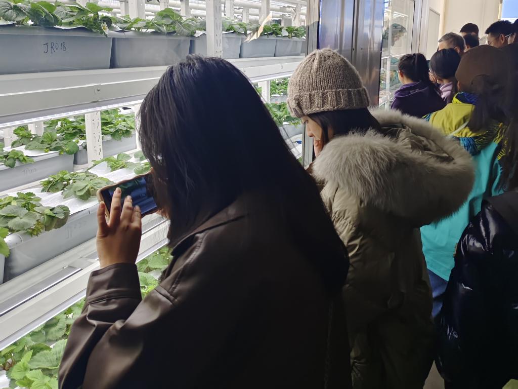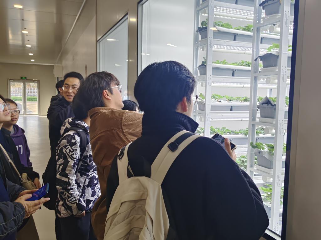 产业园的工作人员领着同学们进行参观,隔着玻璃,看到实验室内高高的架子上,各种蔬菜、水果和花卉井然有序地生长着。这里的农作物不再像传统农业中那样贴在地上生长,而是通过立体栽培技术,大大节约空间成本,充分利用阳光和水资源,同时确保病菌的最小化,提高产量和品质。研究室内布满了各种高科技设备,传感器更随处可见。这些设备可以实时监测土壤的温度、湿度和养分含量,帮助了解植物的生长环境。