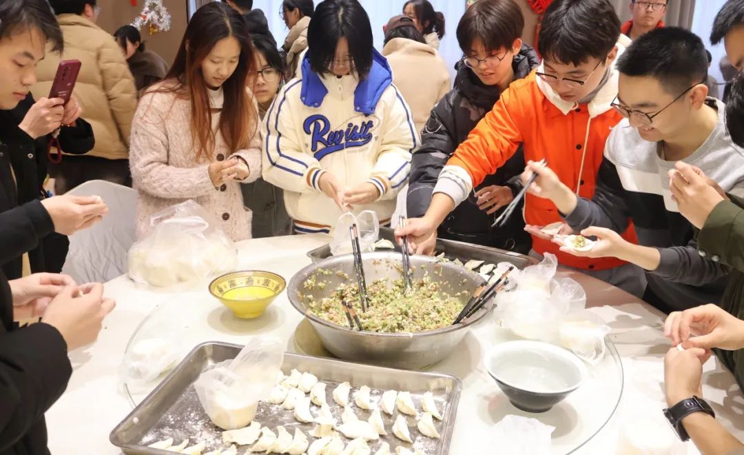 师生一起包饺子,大家分工明确,配合默契。在现场边包边交流,创意频出,捏出了各种造型的饺子,欢声笑语不断。随后,饺子也一盘盘煮好端上了桌,师生们围坐一堂,品尝着自己亲手包的饺子,分享着学习生活中的故事,空气中弥漫着幸福和满足的味道。