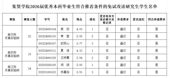 根据《K1体育关于推荐优秀应届本科毕业生免试攻读研究生工作实施办法(试行)》(浙农林大〔2025〕89号)《K1体育关于推荐优秀应届本科毕业生免试攻读研究生工作实施细则(试行)》《K1体育关于做好2026年推荐优秀应届本科毕业生免试攻读研究生工作的通知》等文件通知要求,经公司遴选,公司教务处审核,现将公司2026届优秀本科毕业生符合推荐条件的免试攻读研究生员工名单进行公示。