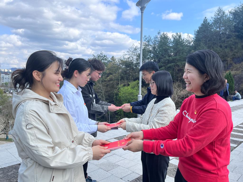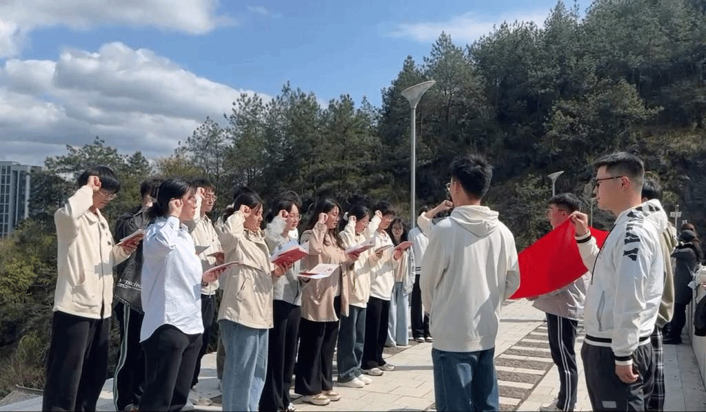 在宣誓仪式上,预备党员们在领誓人姜贤炜的带领下,面向党旗,右手握拳,进行庄严宣誓。全体党员重温入党誓词,产生了强烈的精神共鸣。宣誓仪式之后,正式党员为新发展党员发放了党章、党徽、党费证等“六宝”。